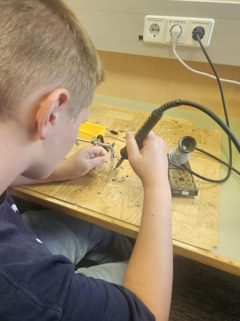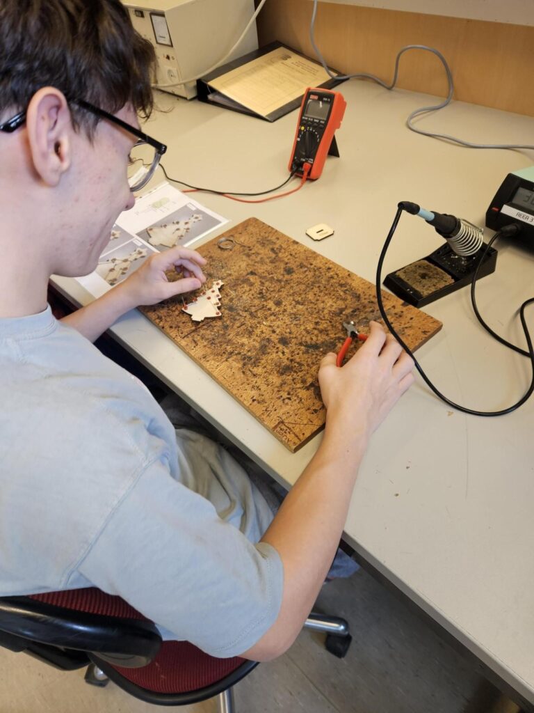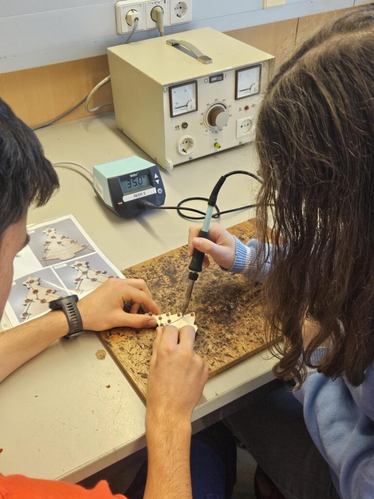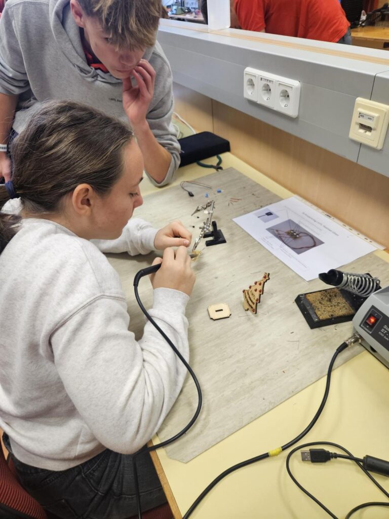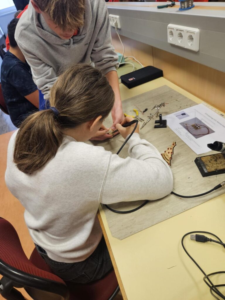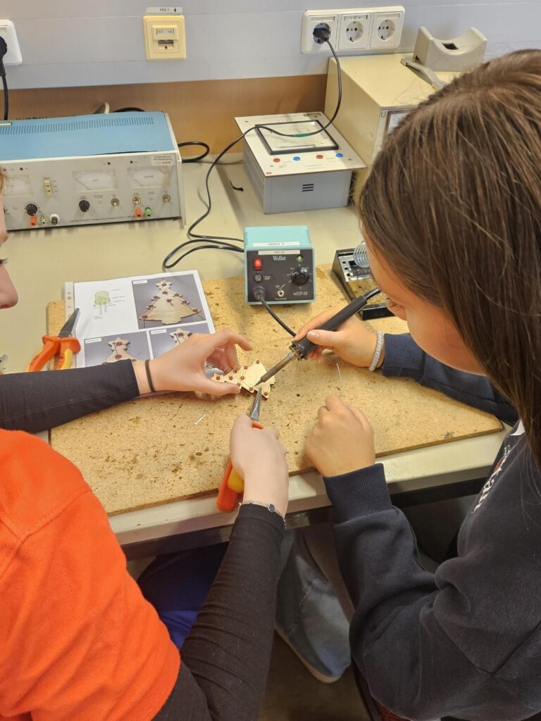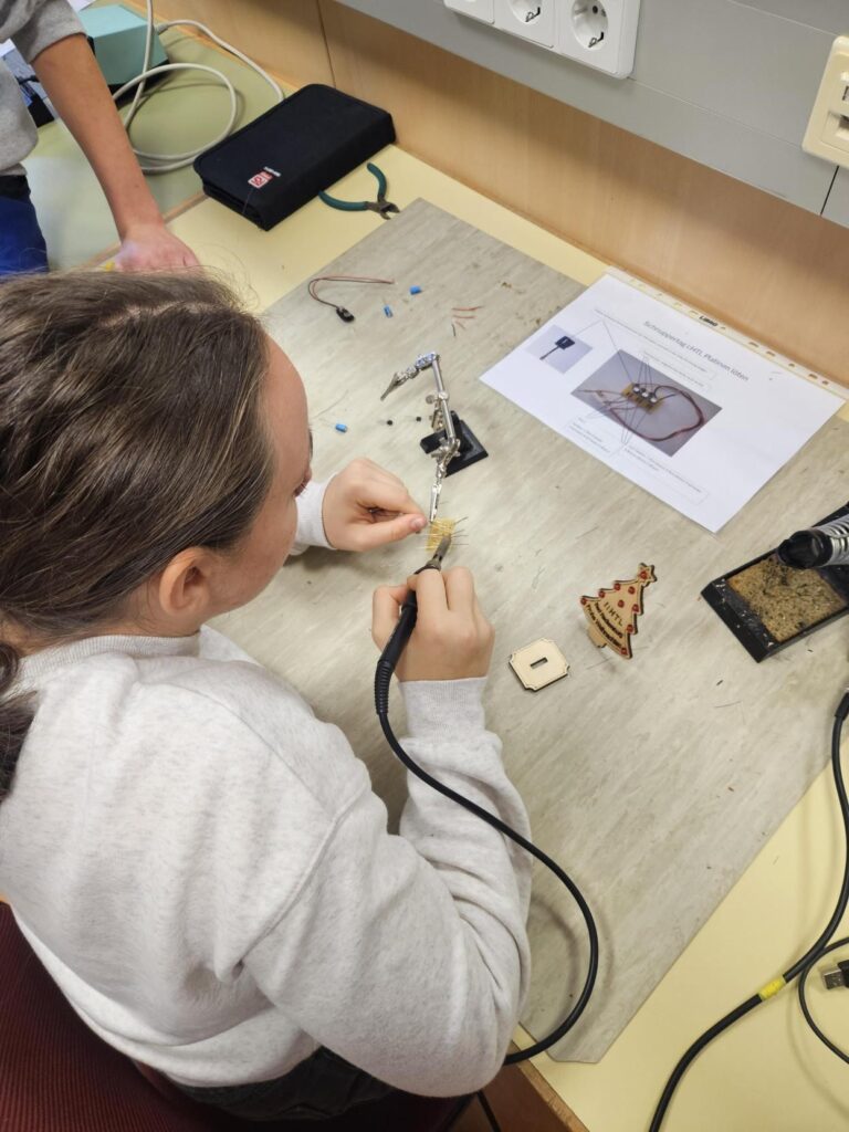 Bei verschiedenen Stationen erhielten sie zum einen eine Schulführung durch die dortigen Räumlichkeiten. Zum anderen konnten sie einen kleinen Weihnachtsbaum aus Holz anfertigen. Dazu konnten sie zuerst ihren Namen in den Holzfuß des Baumes lasern. In weiterer Folge wurden ihre Lötfähigkeit an LEDs und einer Platine getestet. Hier war viel Fingerspitzengefühl gefragt. Mit etwas Geduld und Geschick gingen die Schülerinnen und Schüler mit einem blinkenden Christbaum und vielen neuen Eindrücken nach Hause.
