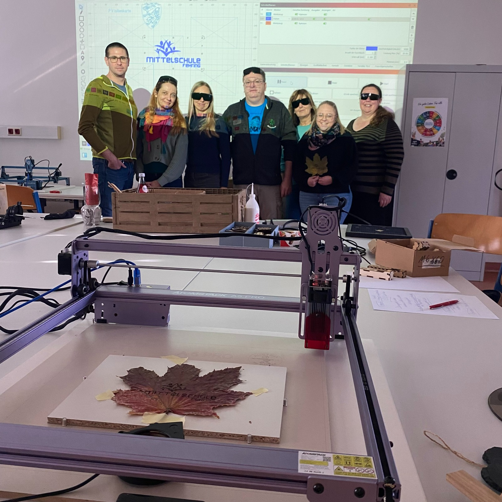 Am Freitag nahmen einige Lehrer:innen an einem Lasergravur-Workshop teil. Es wurde gezeigt, dass die Lasergravur sowohl auf Holz als auch auf getrockneten Blättern möglich ist.