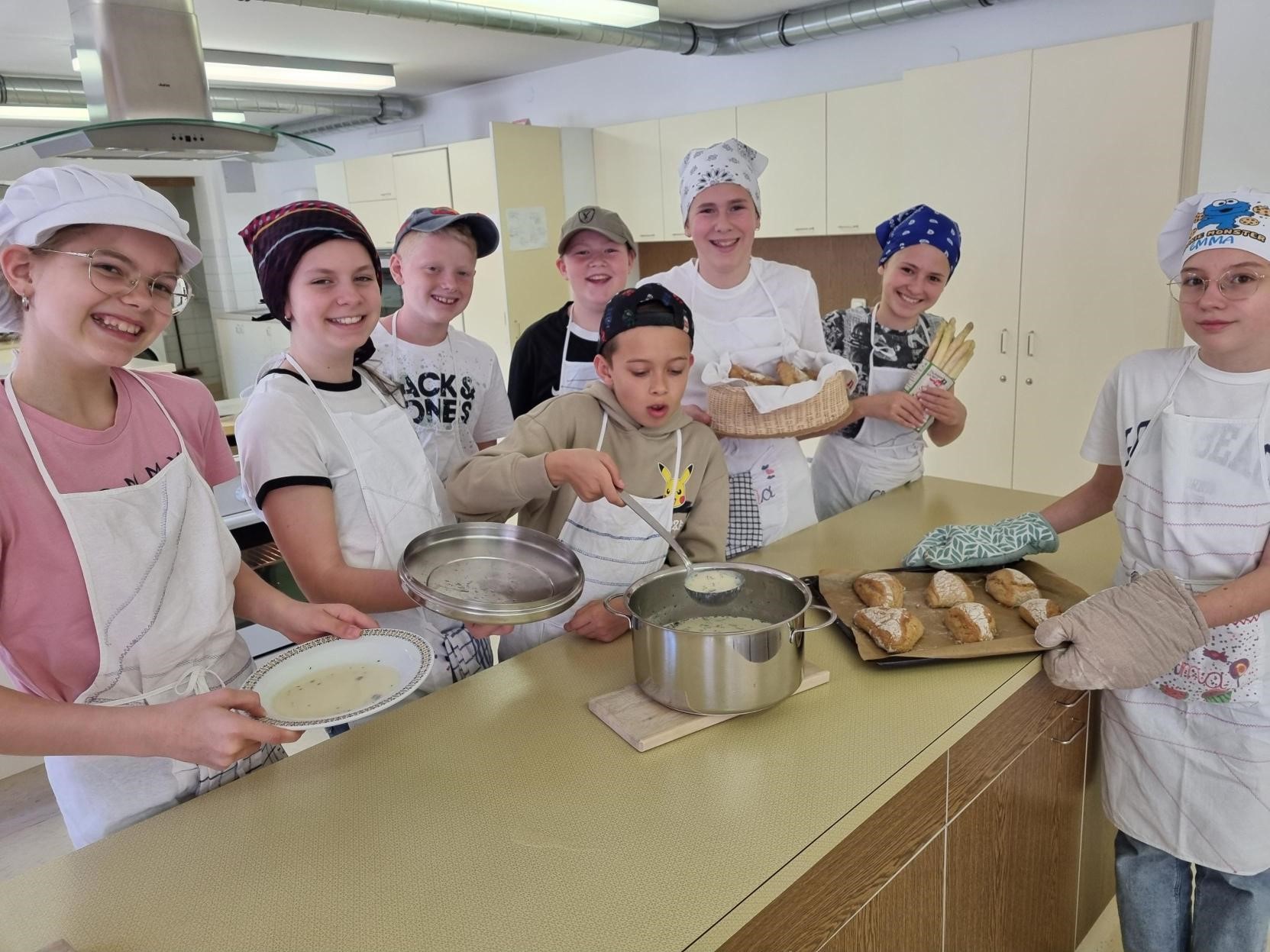 Im Unterricht Ernährung und Haushalt steht saisonales Kochen stehts auf dem Programm: Spargelcremesuppe mit frischen Kräutern und dazu selbst gebackene Brötchen